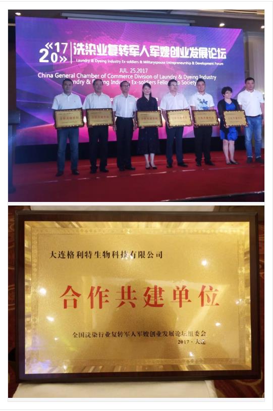2017年7月25日洗染業(yè)復轉軍人軍嫂創(chuàng)業(yè)發(fā)展論壇曁軍人俱樂部聯(lián)誼活動在大連圓滿結束。大連市洗染行業(yè)協(xié)會副會長、大連市洗染行業(yè)協(xié)會公用紡織品辦公室主任、大連格利特生物科技有限公司董事長延金祥先生上臺領取“合作共建單位”稱號獎牌。